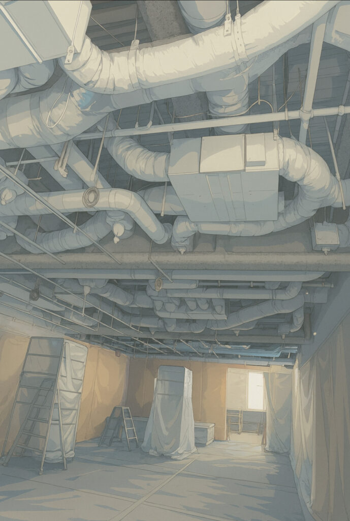 天井ボードを取り払ってスケルトン天井としています。